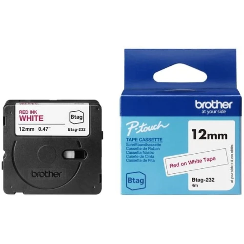 Brother original BTAG232 rød på hvit 12mm ulaminert merketape er perfekt for allsidig organisering i hjemmet. Lag merkelapper for å organisere gjenstander på kjøkkenet, hjemmekontoret og personlige gjenstander, samt for å merke oppbevaringsbokser, barnas skolebøker og skrivesaker. Btag tape er holdbar og motstandsdyktig mot mange av forholdene under daglig bruk i hjemmet. Merkelappene tåler mikrobølgeovn, fryser, oppvaskmaskin, husholdningsvæsker og vann, noe som betyr at de vil forbli intakt og leselig over tid. - Merketape for allsidig bruk - Perfekt for merking og organisering - Holdbar og motstandsdyktig - Farge: Rød på hvit - Bredde: 12mm - Lengde: 4m - Kompatibel med: Btag PTN-serien