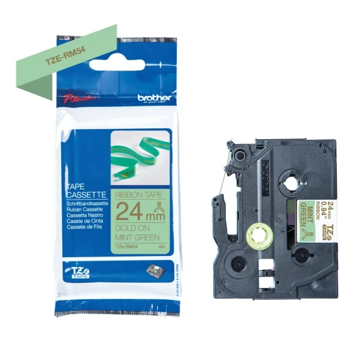 Silkebånd BROTHER TZERM54 i gull på mintgrønt i 24 mm bredde som gir deg et raskt og pålitelig resultat, samt en tydelig og profesjonell utskriftsstandard.