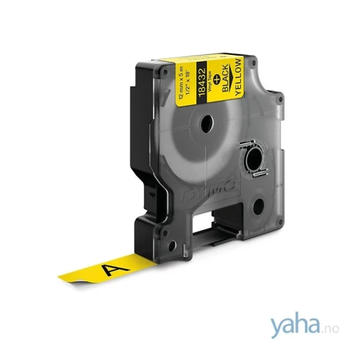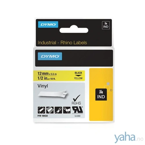 Oppdag kvaliteten av Dymo Tape Rhino Vinyl Sort på Gul 12mm (5m), varenummer 18432. Perfekt for Dymo Rhino 3000, 4200, 5000, 5200, 6000 og Rhinopro 5000. Oppdag forskjellen!